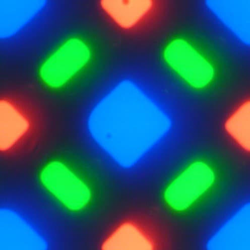 В этом экране используется матрица Super AMOLED — активная матрица на органических светодиодах. Полноцветное изображение создается с помощью субпикселей трех цветов — красного (R), зеленого (G) и синего (B), но красных и синих субпикселей в два раза меньше, что можно обозначить как RGBG. Это подтверждается фрагментом микрофотографии: