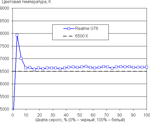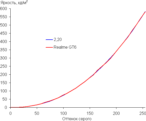 Напомним, что в случае OLED-экранов яркость фрагментов изображения динамично меняется в соответствии с характером выводимого изображения — немного уменьшается для светлых в целом изображений. В итоге полученная зависимость яркости от оттенка (гамма-кривая), скорее всего, не точно соответствует гамма-кривой статичного изображения, так как измерения проводились при последовательном выводе оттенков серого почти на весь экран.
