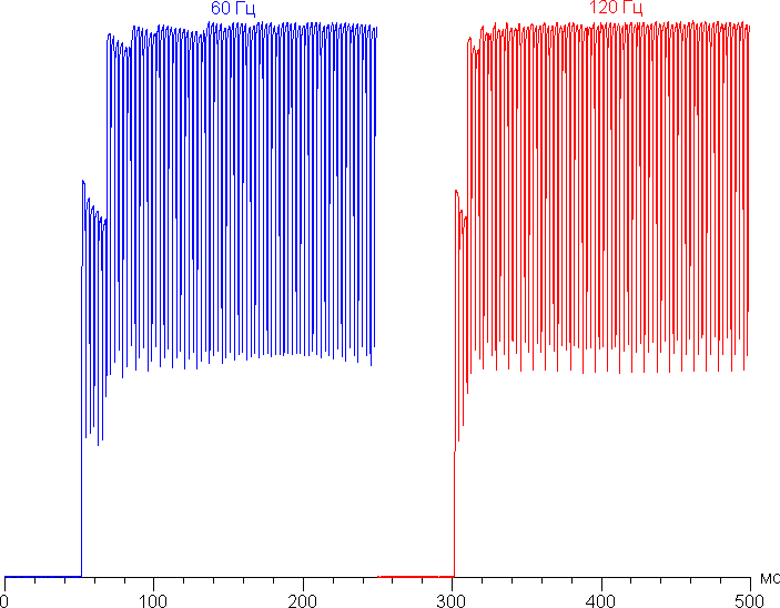 Переключение состояния элементов матрицы выполняется практически мгновенно, но на фронте включения может присутствовать ступенька шириной примерно 17 мс (что соответствует частоте обновления экрана примерно в 60 Гц) или примерно 8 мс (120 Гц). Например, так выглядит зависимость яркости от времени при переходе от черного к белому (режим 60 Гц и 120 Гц):