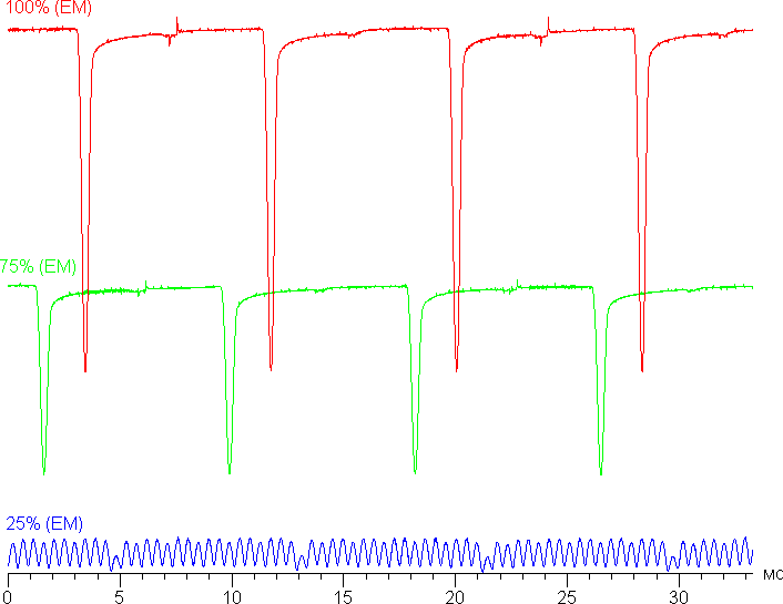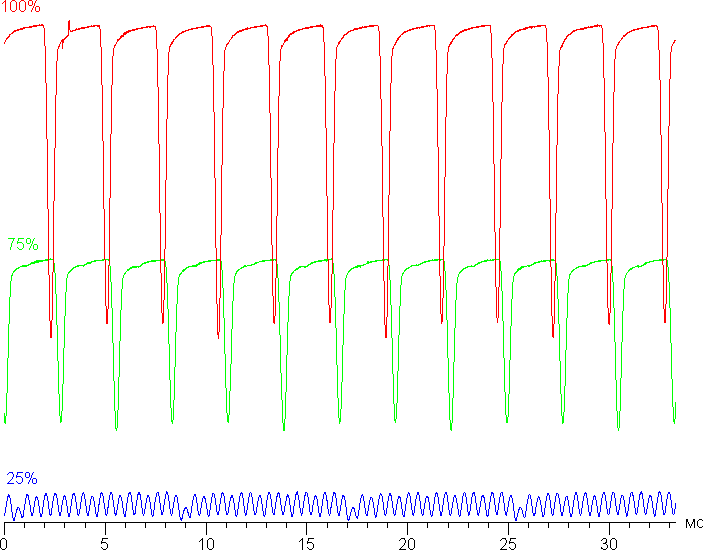 Видно, что на высокой и средней яркости скважность модуляции низкая, да и частота довольно высокая, в итоге видимого мерцания нет. При сильном понижении яркости появляется модуляция, но с высокой частотой (2160 Гц), поэтому видимое мерцание всё так же отсутствует.