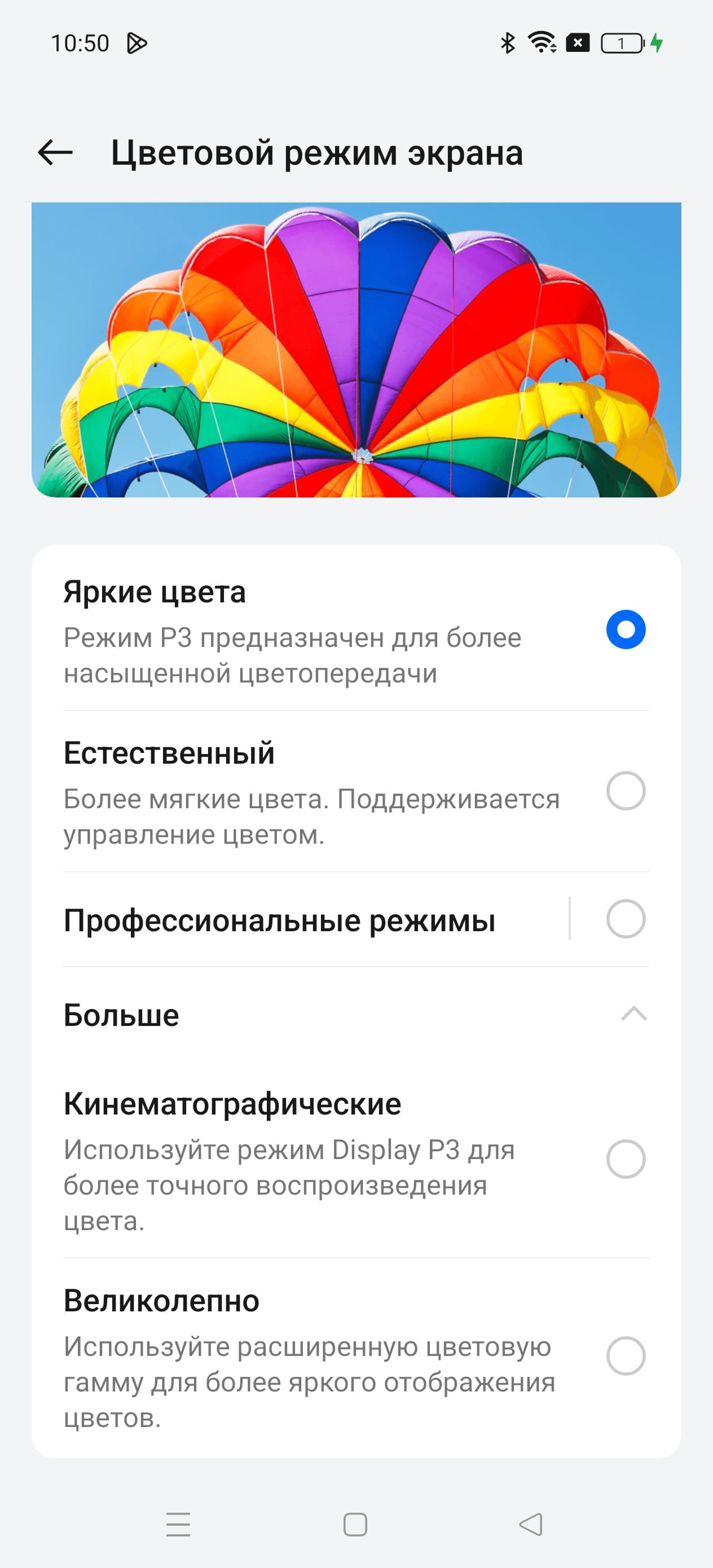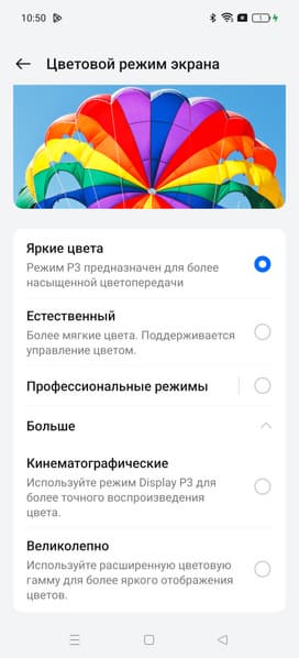 Фотография выше получена для профиля Яркие цвета в настройках экрана, который выбран по умолчанию. Профилей всего четыре: