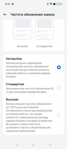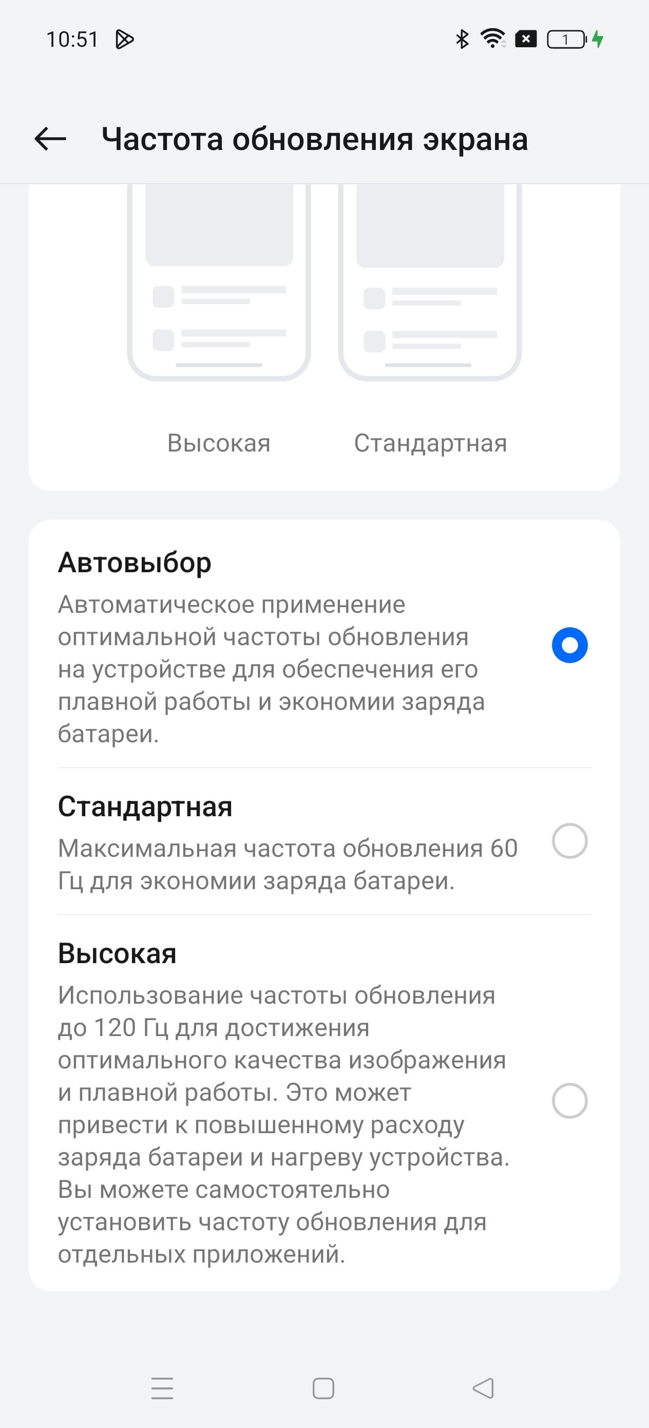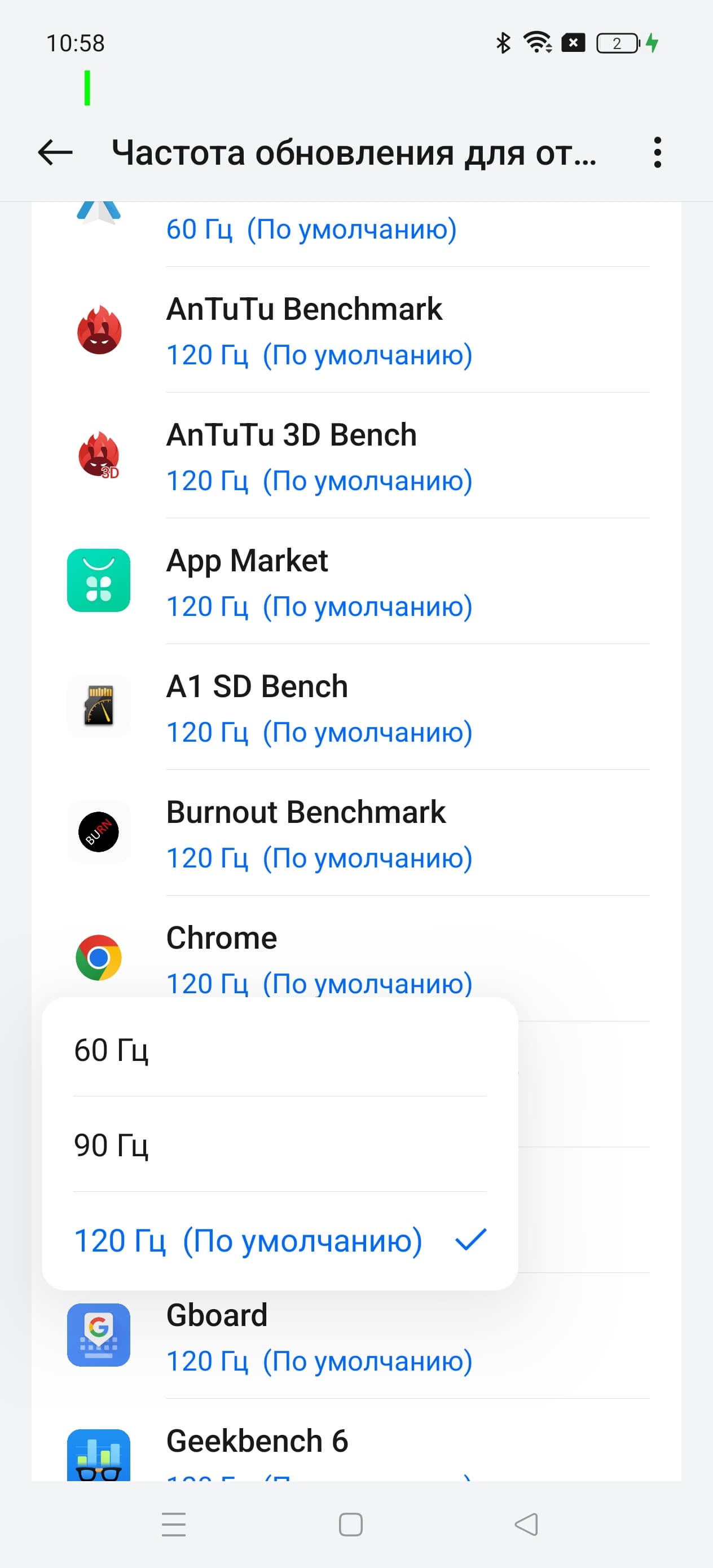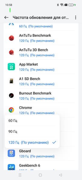 В настройках экрана можно включить режим с повышенной до 120 Гц частотой обновления, при этом для отдельных приложений можно установить свою максимальную частоту: