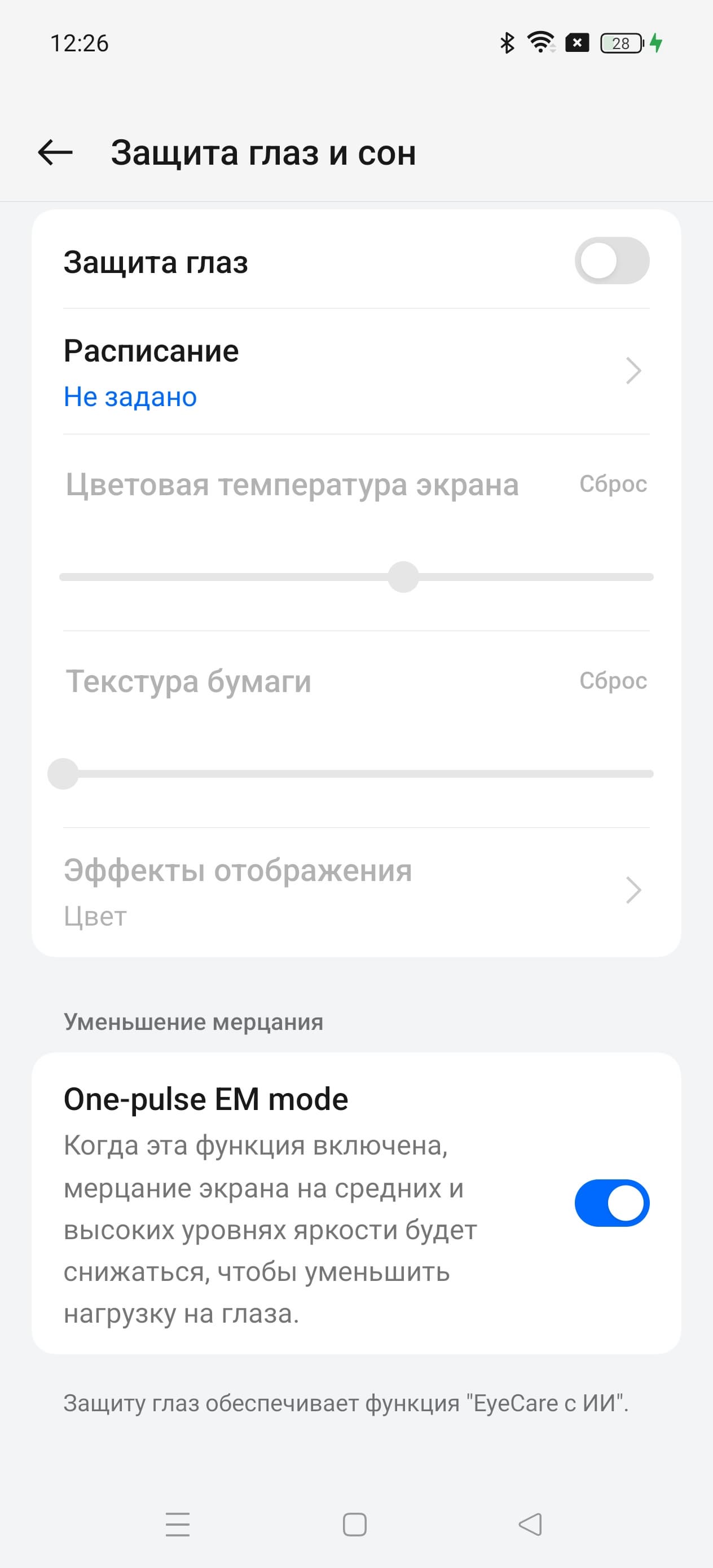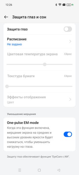 Также есть странная функция One-pulse EM mode, которая должна снижать мерцание (которого и так не видно) на высокой и средней яркости.