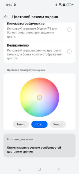 Дополнительно в этом устройстве есть возможность скорректировать цветовой баланс с помощью выбора профиля цветовой температуры или регулировки оттенка на цветовом круге. Но особого смысла это делать нет, достаточно выбрать профиль Естественный. Также в настройках можно уменьшить интенсивность синей компоненты. В принципе, яркий свет может приводить к нарушению суточного (циркадного) ритма (см. статью про iPad Pro с дисплеем 9,7 дюйма), но все решается снижением яркости до низкого, но еще комфортного уровня, а искажать цветовой баланс, уменьшая вклад синего, нет абсолютно никакого смысла.