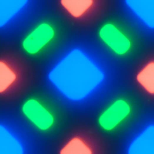 На фрагменте выше можно насчитать 4 зеленых субпикселя, 2 красных (4 половинки) и 2 синих (1 целый и 4 четвертушки), при этом, повторяя эти фрагменты, можно выложить весь экран без разрывов и перехлеста. Для таких матриц компания Samsung ввела наименование PenTile RGBG. Разрешение экрана производитель считает по зеленым субпикселям, по двум другим оно будет ниже. Разумеется, присутствуют некоторая неровность контрастных границ и другие артефакты. Впрочем, из-за высокого разрешения они лишь минимально сказываются на качестве изображения.