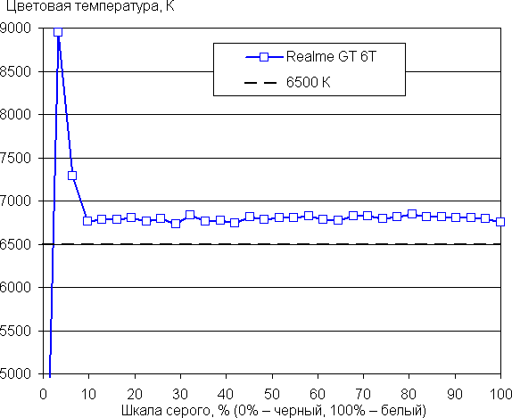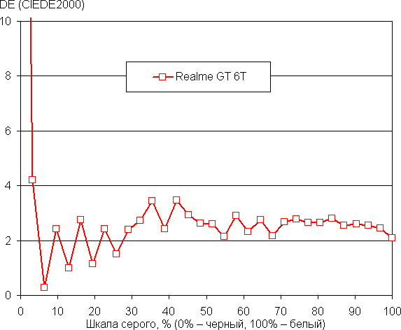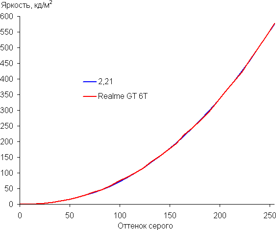 Напомним, что в случае OLED-экранов яркость фрагментов изображения динамично меняется в соответствии с характером выводимого изображения — немного уменьшается для светлых в целом изображений. В итоге полученная зависимость яркости от оттенка (гамма-кривая), скорее всего, не точно соответствует гамма-кривой статичного изображения, так как измерения проводились при последовательном выводе оттенков серого почти на весь экран.