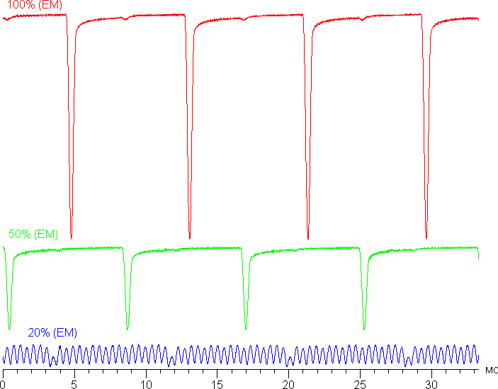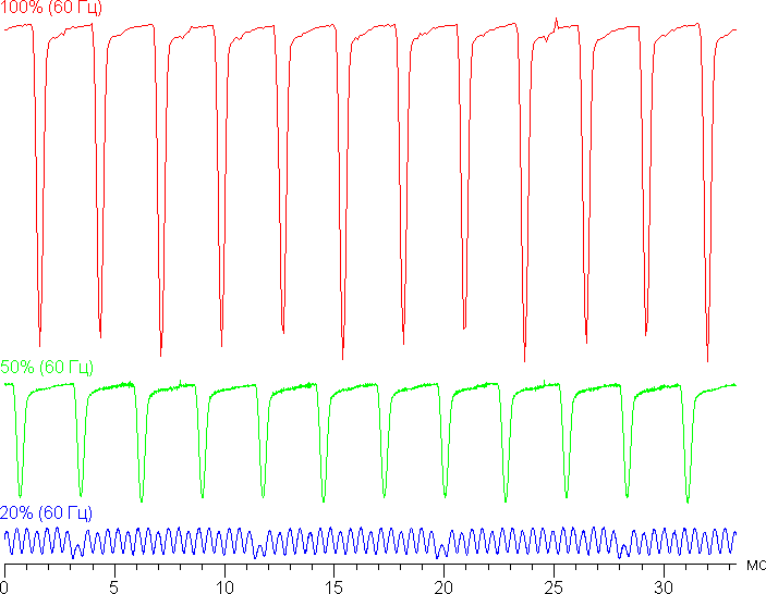На высоком и среднем уровне яркости присутствует значимая модуляция с частотой 360 Гц. На рисунке ниже приведены зависимости яркости (вертикальная ось) от времени (горизонтальная ось) для нескольких значений настройки яркости: