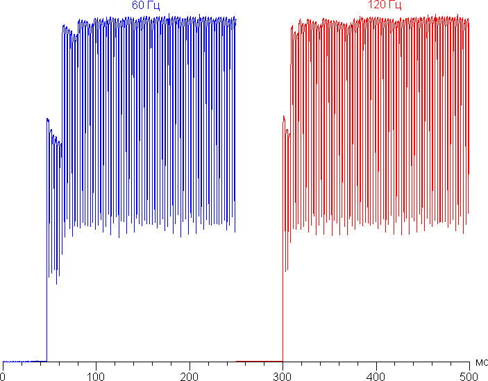 Переключение состояния элементов матрицы выполняется практически мгновенно, но на фронте включения может присутствовать ступенька шириной примерно 17 мс (что соответствует частоте обновления экрана примерно в 60 Гц) или примерно 8 мс (120 Гц). Например, так выглядит зависимость яркости от времени при переходе от черного к белому (режим 60 Гц и 120 Гц):
