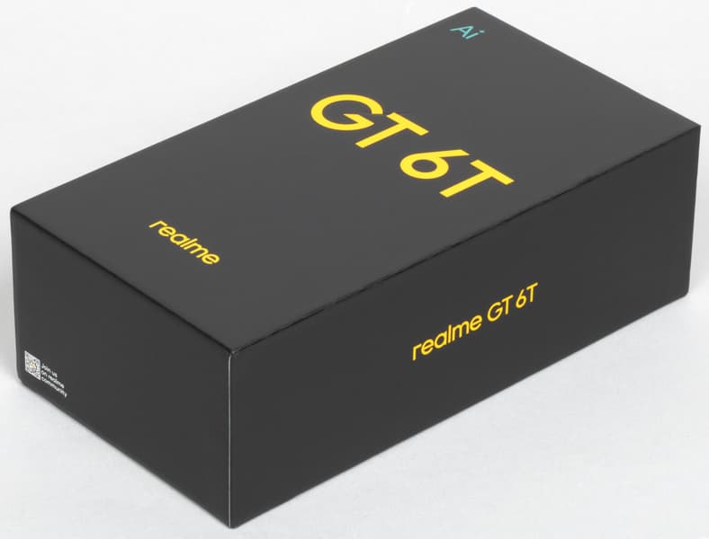 Смартфон Realme GT 6T поставляется в твердой картонной упаковке со сдержанным лаконичным оформлением.