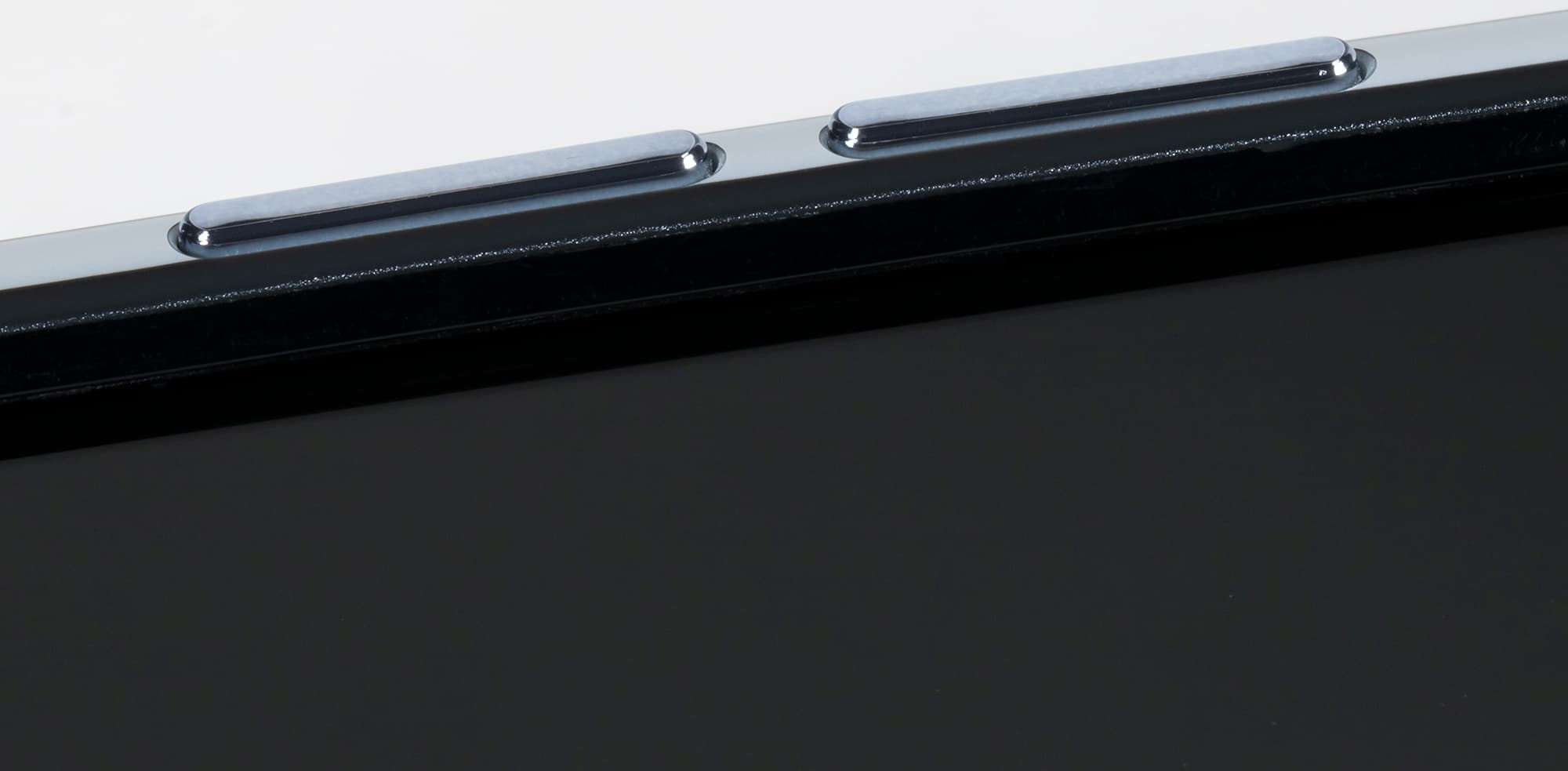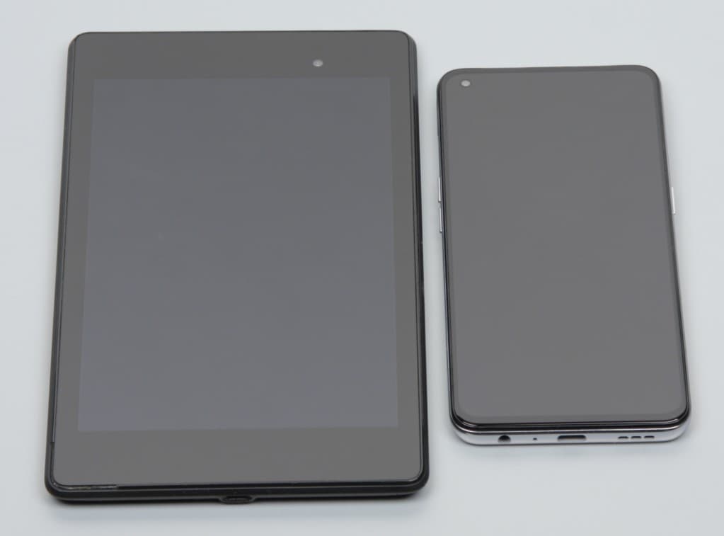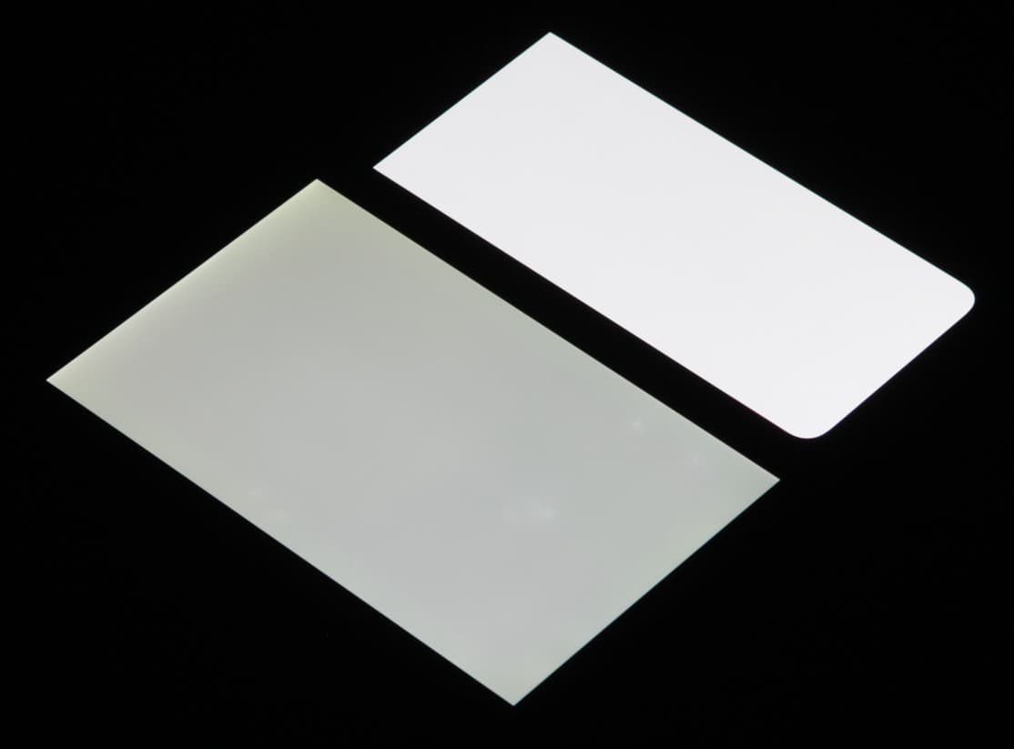 Лицевая поверхность экрана выполнена в виде стеклянной пластины с зеркально-гладкой поверхностью, устойчивой к появлению царапин. Судя по отражению объектов, антибликовые свойства экрана не хуже, чем у экрана Google Nexus 7 (2013) (далее просто Nexus 7). Для наглядности приведем фотографию, на которой в выключенных экранах отражается белая поверхность (слева — Nexus 7, справа — Realme GT Master Edition, далее их можно различать по размеру):