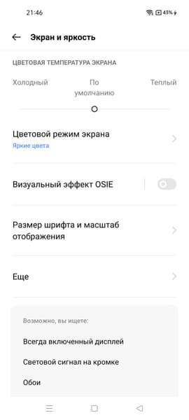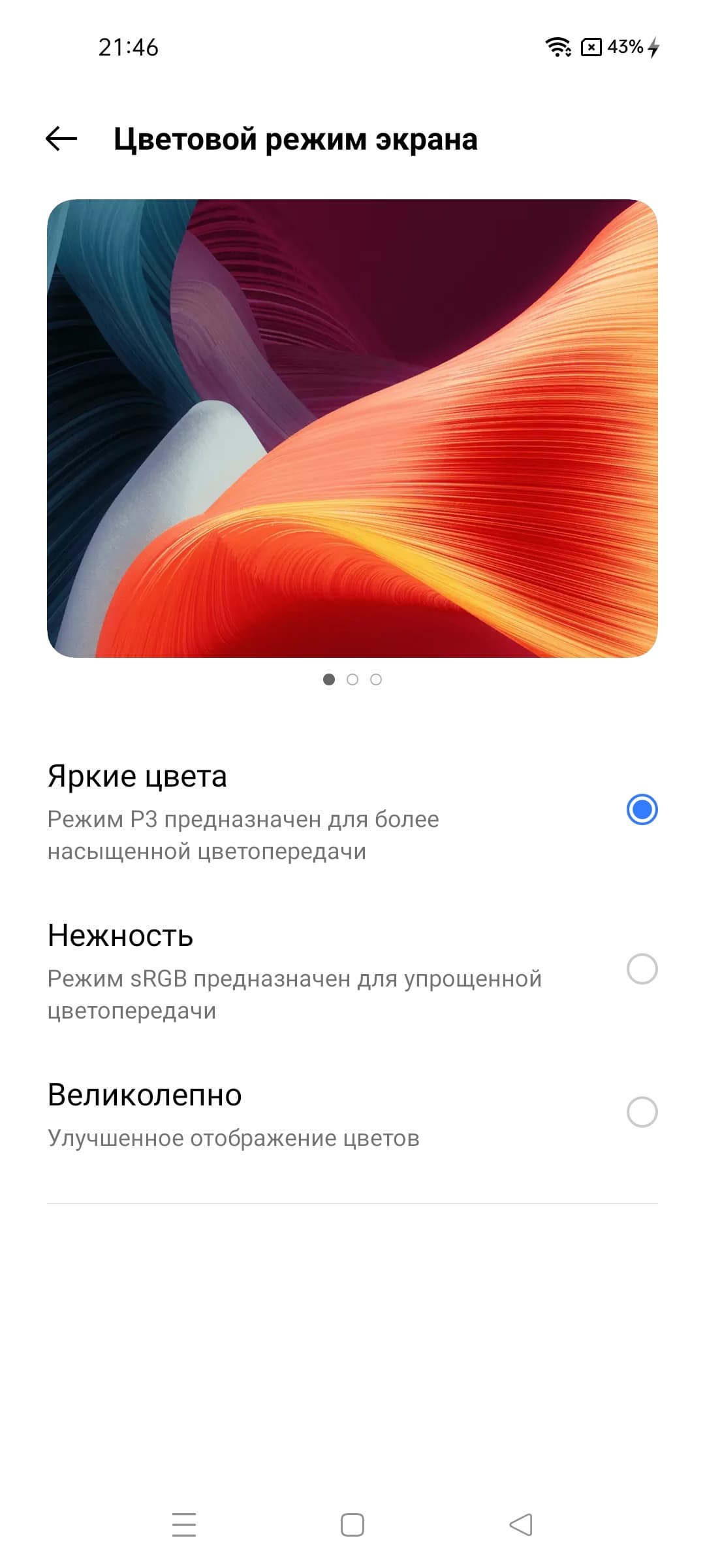 Фотография выше получена для профиля Яркие цвета в настройках экрана, который выбран по умолчанию. Профилей всего три: