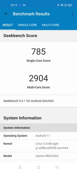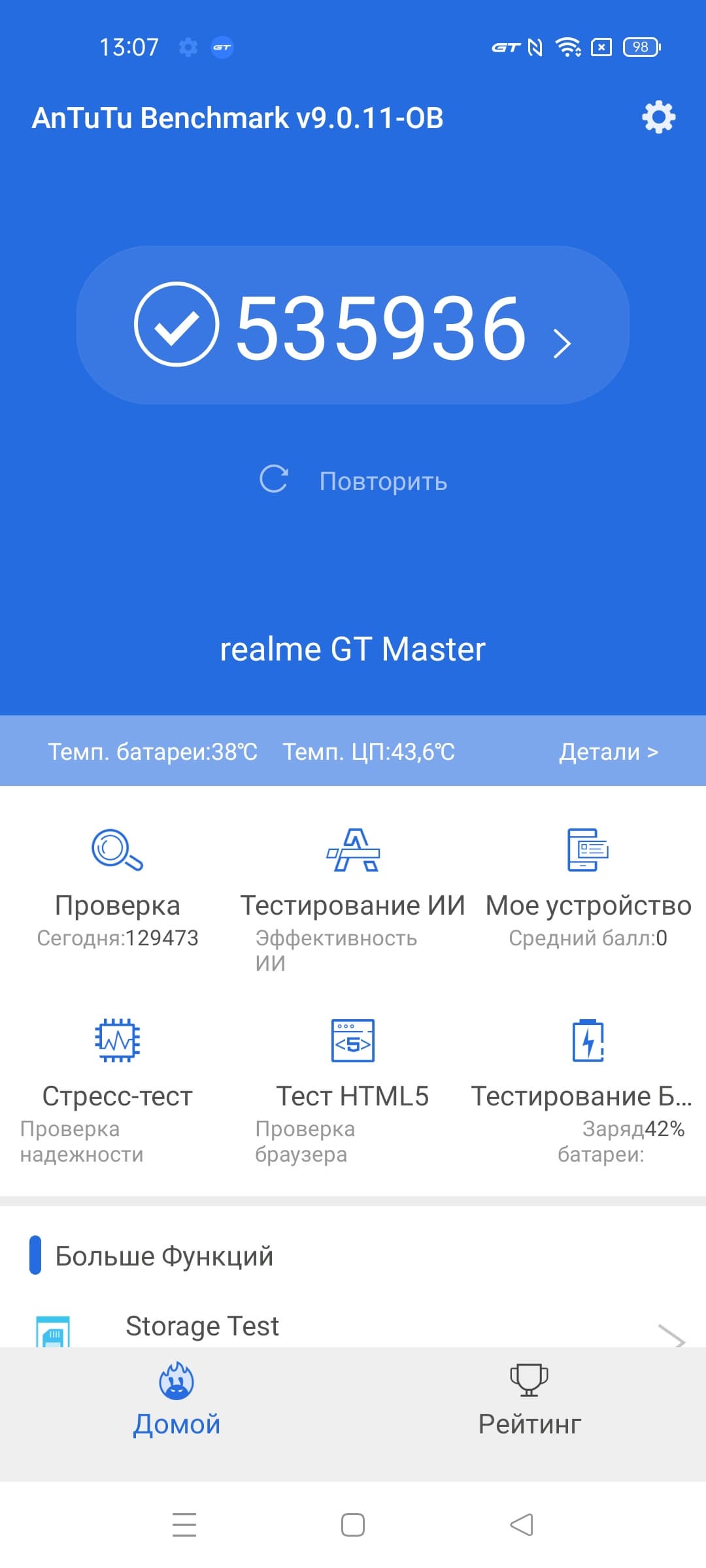 Realme GT Master Edition на субфлагманской SoC Snapdragon 700-й серии, произведенной по техпроцессу 6 нм, демонстрирует достойные результаты в синтетических тестах и не страдает от недостатка производительности в реальной эксплуатации. Платформа совсем свежая и очень добротная, ее возможностей хватает для плавной работы интерфейса, быстрого открытия любых приложений и возможности играть в любые, даже требовательные игры на средних и высоких настройках графики. С самыми требовательными играми (Call of Duty Mobile, Injustice 2) аппарат справляется без притормаживаний.