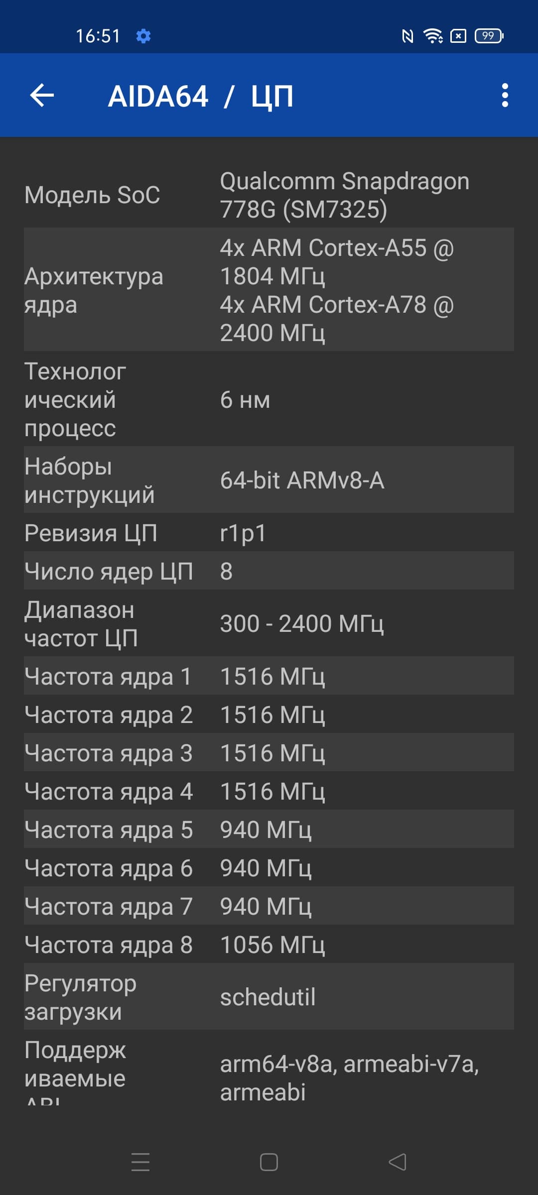 - SoC Qualcomm SM7325 Snapdragon 778G 5G, 8 процессорных ядер (4×Cortex-A78 @2,4 ГГц + 4×Cortex-A55 @1,8 ГГц)