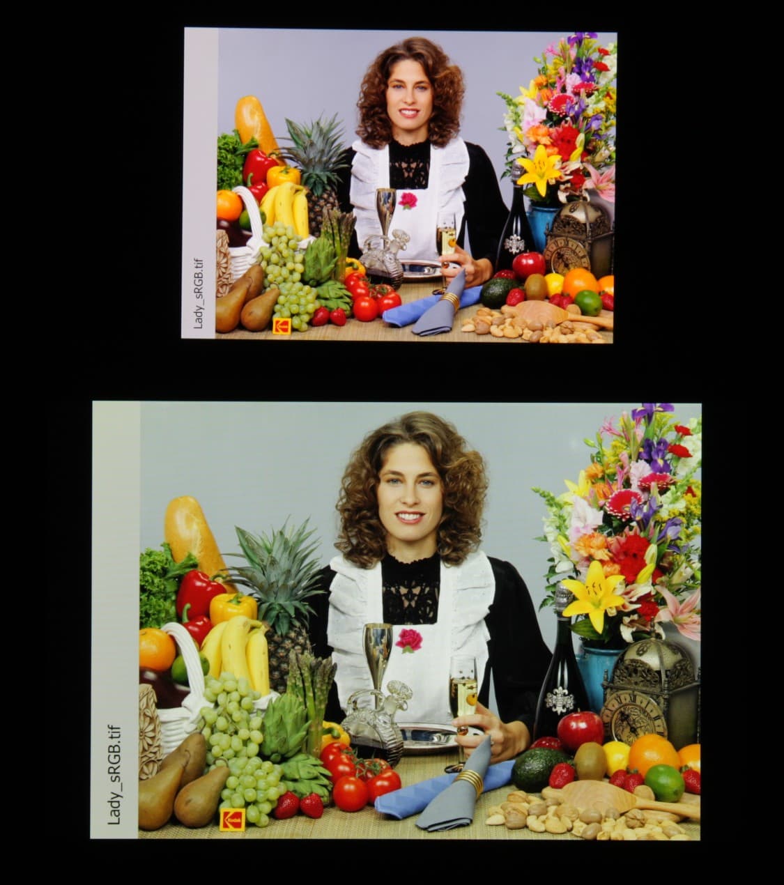Отметим, что на экранах с широким цветовым охватом без соответствующей коррекции цвета обычных изображений, оптимизированных для устройств sRGB, выглядят неестественно насыщенными. Отсюда и рекомендация: в большинстве случаев смотреть кино, фотографии и все естественное лучше при выборе профиля Нежность. Профиль Яркие цвета уместен при просмотре материала с охватом DCI-P3, принятым в цифровом кинематографе, но в быту встречающимся редко.