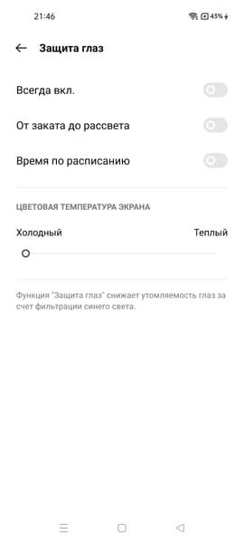 В этом устройстве есть возможность скорректировать цветовой баланс с помощью регулировки оттенка холодный—теплый. Но особого смысла это делать нет, достаточно выбрать профиль Нежность. Также в настройках можно уменьшить интенсивность синей компоненты: