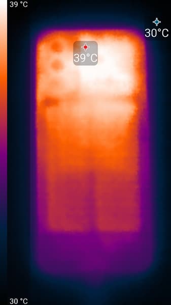 Нагрев больше в верхней части аппарата, что, видимо, соответствует расположению микросхемы SoC. По данным теплокамеры, максимальный нагрев составил 39 градусов (при температуре окружающего воздуха в 24 градуса), это не очень много.