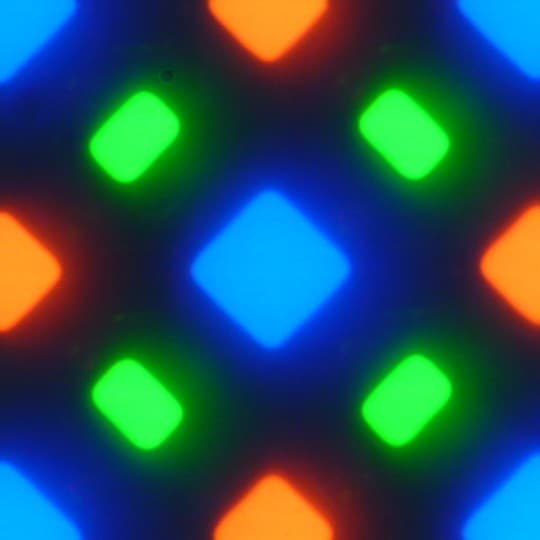 В этом экране используется матрица Super AMOLED — активная матрица на органических светодиодах. Полноцветное изображение создается с помощью субпикселей трех цветов — красного (R), зеленого (G) и синего (B), но красных и синих субпикселей в два раза меньше, что можно обозначить как RGBG. Это подтверждается фрагментом микрофотографии:
