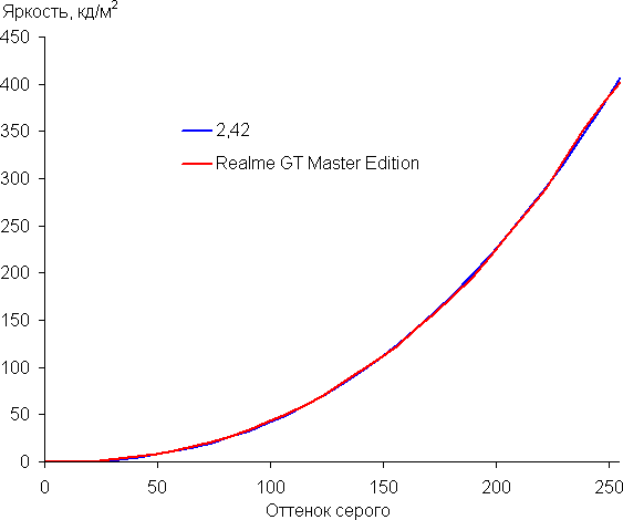 Напомним, что в случае OLED-экранов яркость фрагментов изображения динамично меняется в соответствии с характером выводимого изображения — немного уменьшается для светлых в целом изображений. В итоге полученная зависимость яркости от оттенка (гамма-кривая), скорее всего, не точно соответствует гамма-кривой статичного изображения, так как измерения проводились при последовательном выводе оттенков серого почти на весь экран.