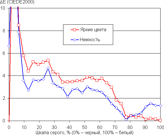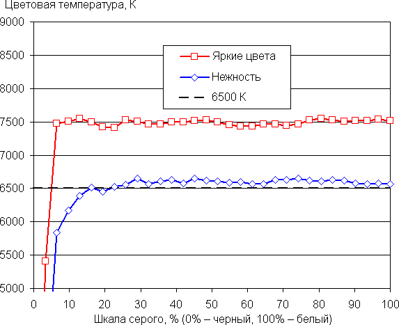 Баланс оттенков на шкале серого после выбора профиля Нежность хороший — цветовая температура достаточно близка к стандартным 6500 К, при этом на значимом участке шкалы серого этот параметр изменяется не очень сильно, что улучшает визуальное восприятие баланса цветов. Отклонение от спектра абсолютно черного тела (ΔE) ниже 10 единиц, что для потребительского устройства считается приемлемым показателем, и разброс этой характеристики также не очень большой: