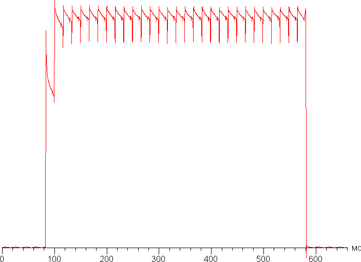 Переключение состояния элементов матрицы выполняется практически мгновенно, но на фронте включения может присутствовать ступенька шириной примерно 17 мс (что соответствует частоте обновления экрана примерно в 60 Гц) или примерно 8 мс (120 Гц). Например, так выглядит зависимость яркости от времени при переходе от черного к белому и обратно (режим 60 Гц):