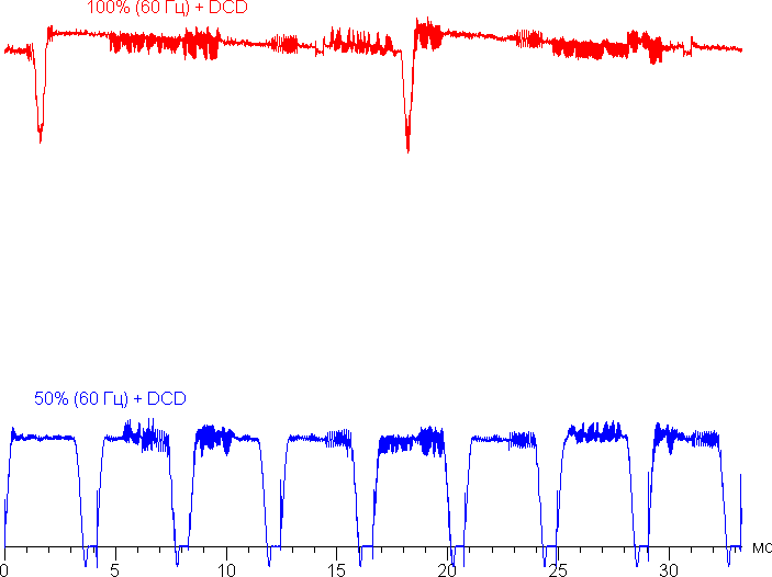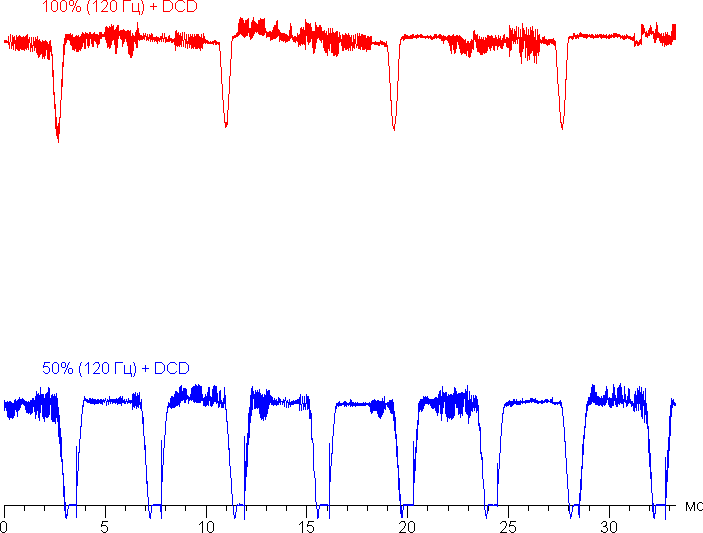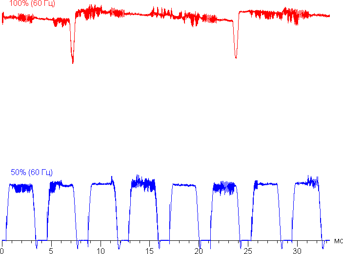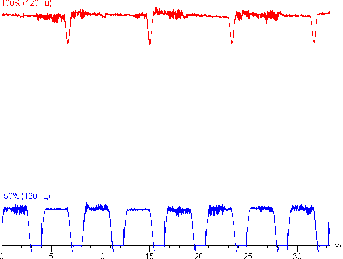 Частота модуляции на высокой яркости увеличилась до 120 Гц, а на низкой характер модуляции такой же, что и в случае частоты обновления 60 Гц. Отметим, что частота повышается до 120 Гц только в случае динамичного изображения, на статичном всегда 60 Гц.