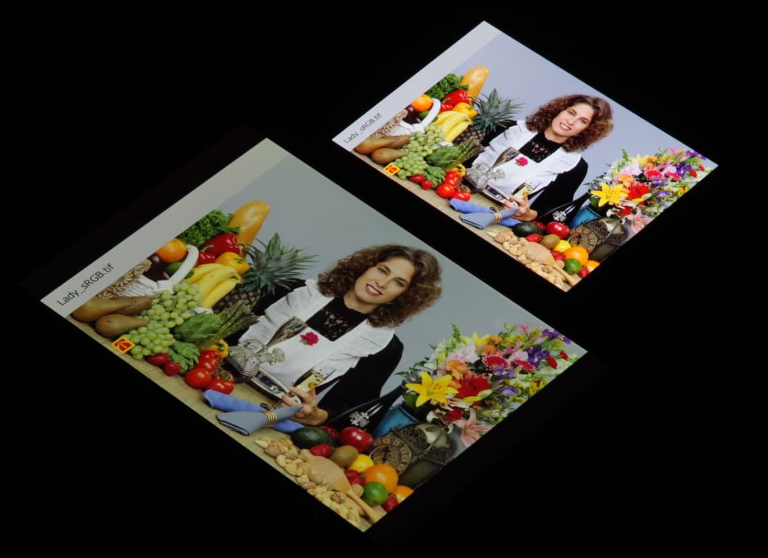 Цвета на экране Realme GT Neo 2 перенасыщены (обратите внимание на помидоры, бананы, салфетку и оттенок лица), а цветовой баланс заметно отличается. Напомним, что фотография не может служить надежным источником сведений о качестве цветопередачи и приводится только для условной наглядной иллюстрации. В частности, выраженный красноватый оттенок белого и серого полей, присутствующий на фотографиях экрана Realme GT Neo 2, при перпендикулярном взгляде визуально отсутствует, что подтверждается аппаратными тестами с помощью спектрофотометра. Причина в том, что спектральная чувствительность матрицы фотоаппарата неточно совпадает с этой характеристикой человеческого зрения.