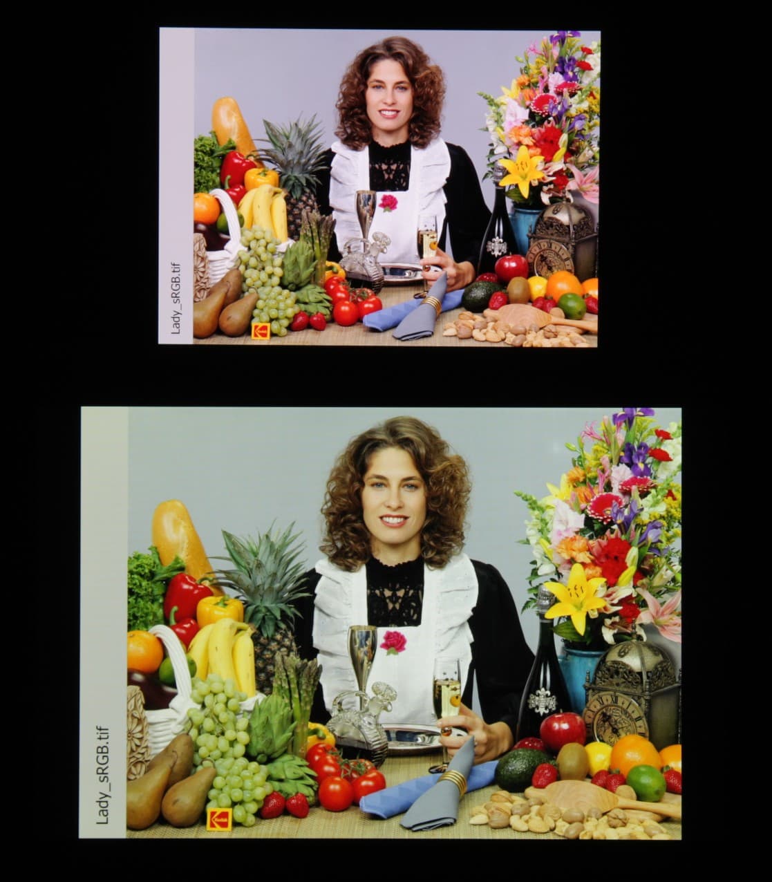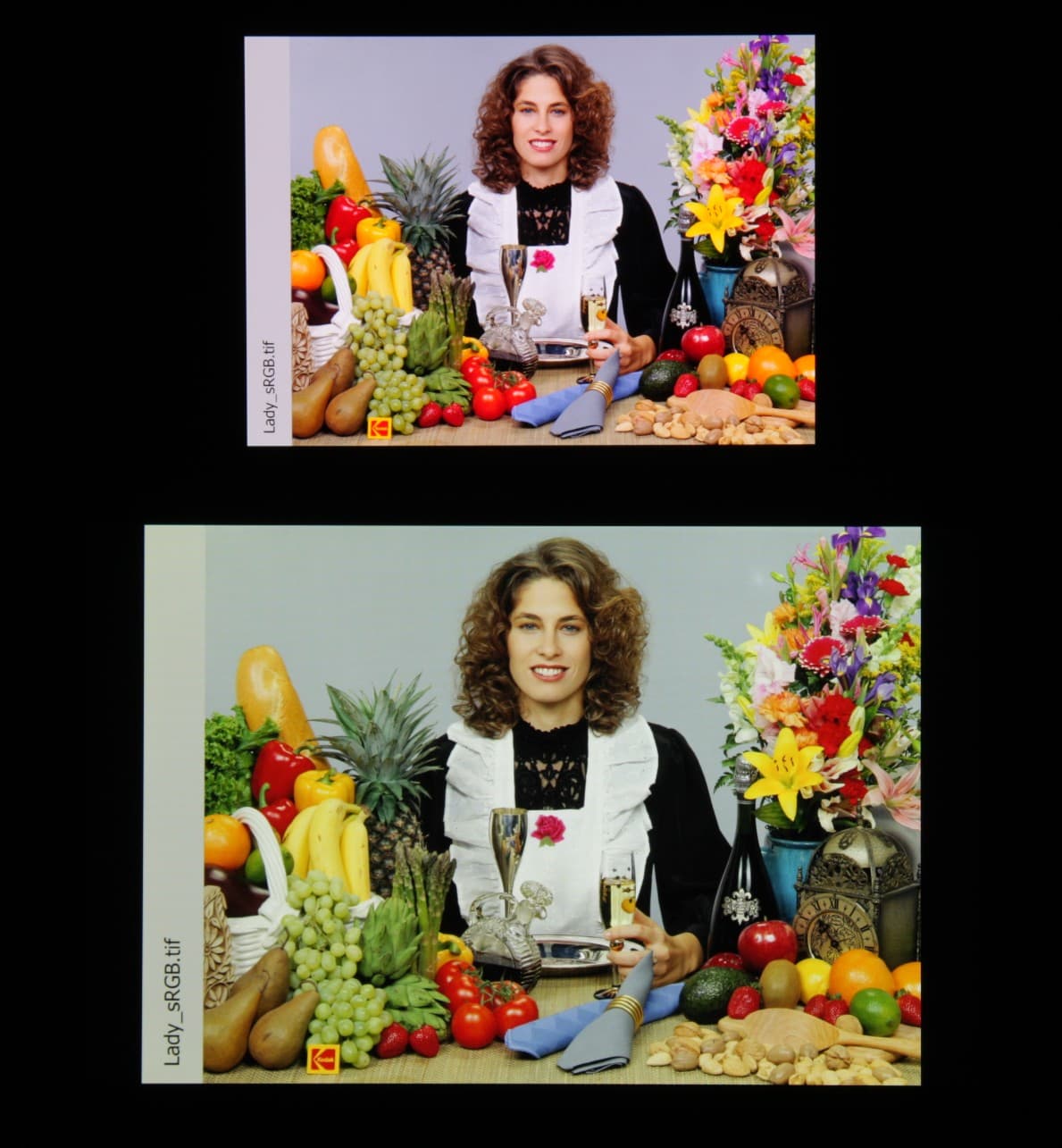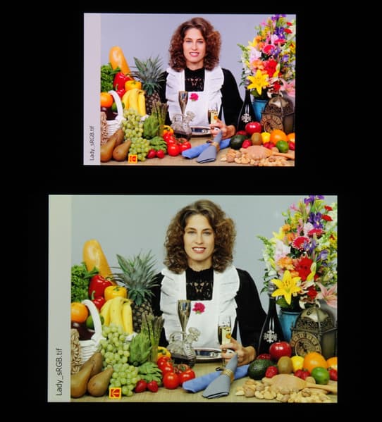 Отметим, что на экранах с широким цветовым охватом без соответствующей коррекции цвета обычных изображений, оптимизированных для устройств sRGB, выглядят неестественно насыщенными. Отсюда и рекомендация: в большинстве случаев смотреть кино, фотографии и все естественное лучше при выборе профиля Нежность. Профиль Яркие цвета уместен при просмотре материала с охватом DCI-P3, принятым в цифровом кинематографе, но в быту встречающимся редко.