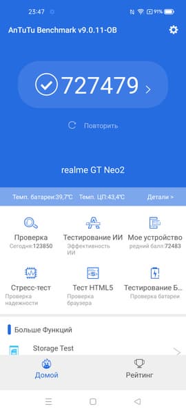 В качестве программной платформы Realme GT Neo 2 использует ОС Android 11 с собственной оболочкой Realme UI 2.0. Интерфейс удобный, но в то же время лаконично оформленный. Этим он приятно отличается от иных китайских оболочек, перегруженных всевозможными настройками. К тому же, здесь нет навязчивой рекламы. Зато есть игровой режим, а также полноценный доступ к магазину Google Play и сервисам Google.