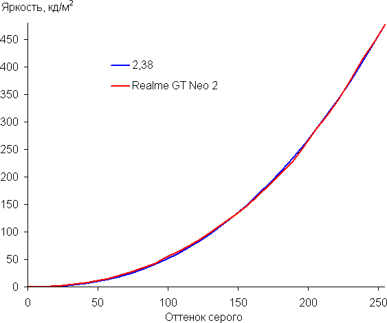 Напомним, что в случае OLED-экранов яркость фрагментов изображения динамично меняется в соответствии с характером выводимого изображения — немного уменьшается для светлых в целом изображений. В итоге полученная зависимость яркости от оттенка (гамма-кривая), скорее всего, не точно соответствует гамма-кривой статичного изображения, так как измерения проводились при последовательном выводе оттенков серого почти на весь экран.