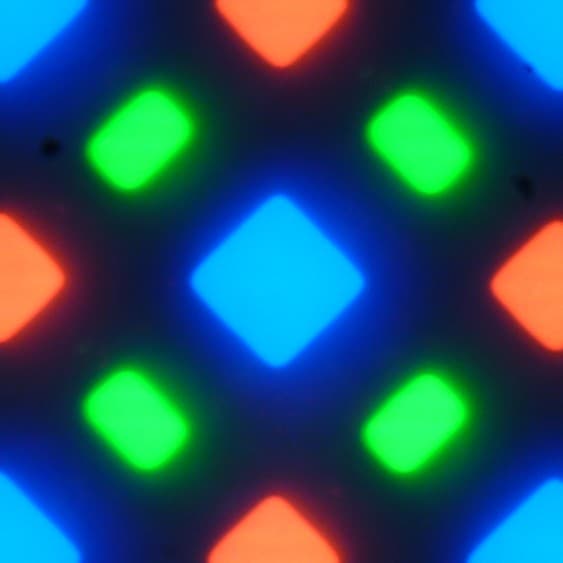 В этом экране используется матрица Super AMOLED — активная матрица на органических светодиодах. Полноцветное изображение создается с помощью субпикселей трех цветов — красного (R), зеленого (G) и синего (B), но красных и синих субпикселей в два раза меньше, что можно обозначить как RGBG. Это подтверждается фрагментом микрофотографии:
