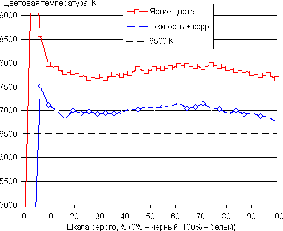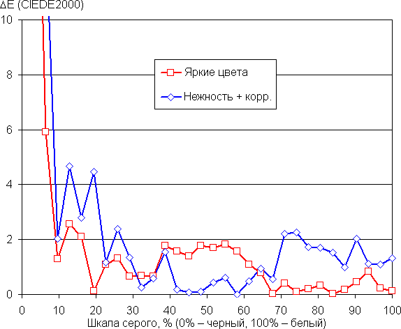 (Самые темные области шкалы серого в большинстве случаев можно не учитывать, так как там баланс цветов не имеет большого значения, да и погрешность измерений цветовых характеристик на низкой яркости высокая.)