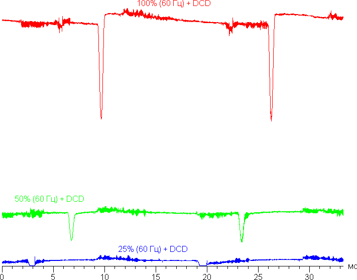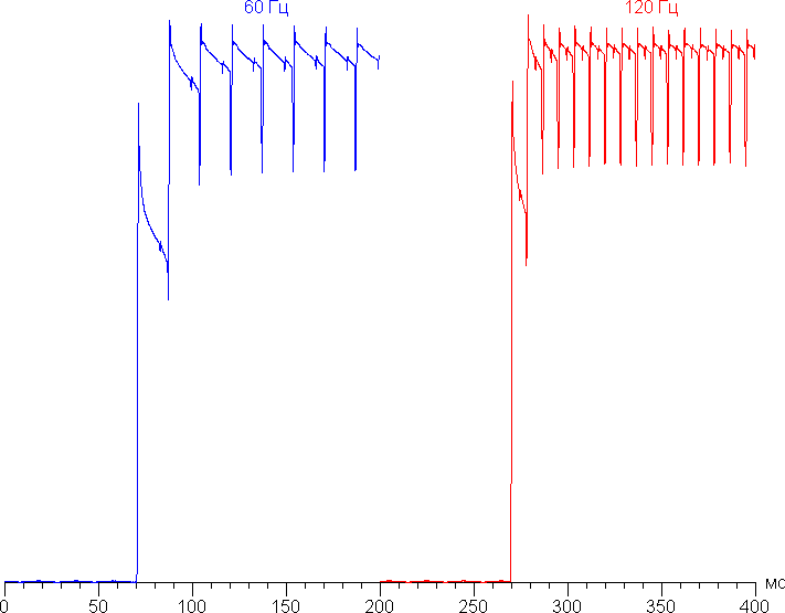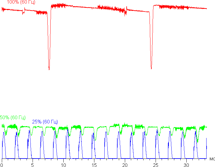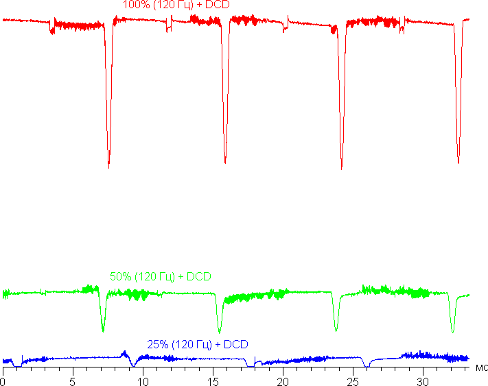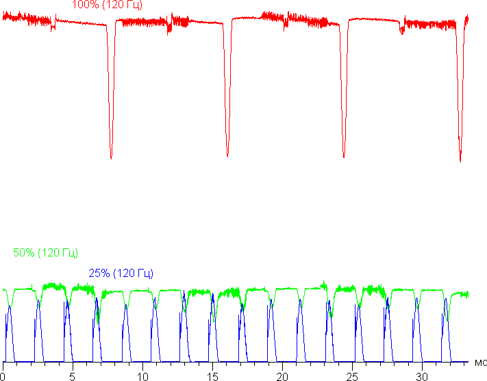 В этом случае частота модуляции увеличилась до 120 Гц, но сам характер модуляции такой же, как в случае частоты обновления 60 Гц. Мерцания также не видно.