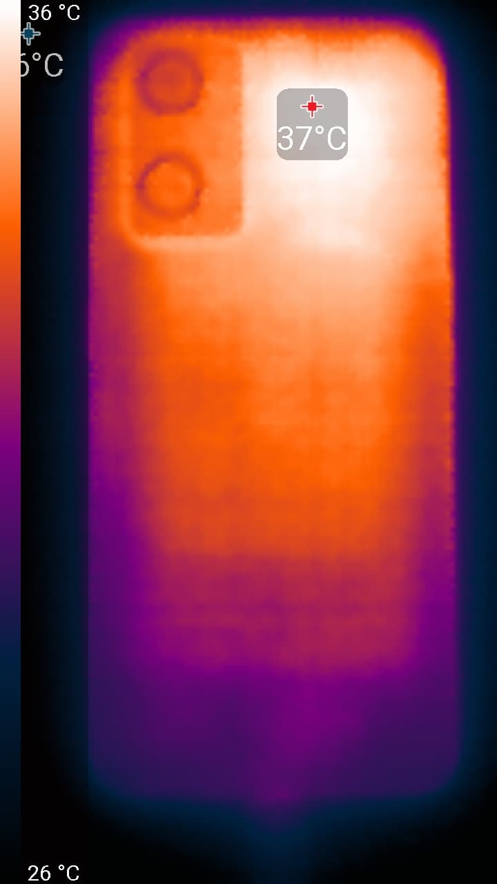 Нагрев больше в верхней части аппарата, что, видимо, соответствует расположению микросхемы SoC. По данным теплокамеры, максимальный нагрев составил 37 градусов (при температуре окружающего воздуха в 24 градуса), это не очень много.