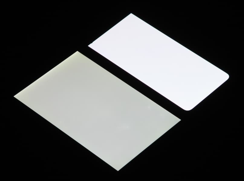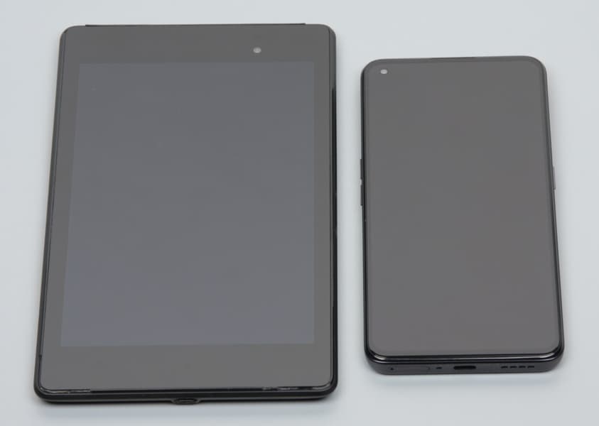 Лицевая поверхность экрана выполнена в виде стеклянной пластины с зеркально-гладкой поверхностью, устойчивой к появлению царапин. Судя по отражению объектов, антибликовые свойства экрана не хуже, чем у экрана Google Nexus 7 (2013) (далее просто Nexus 7). Для наглядности приведем фотографию, на которой в выключенных экранах отражается белая поверхность (слева — Nexus 7, справа — Realme GT Neo 2, далее их можно различать по размеру):