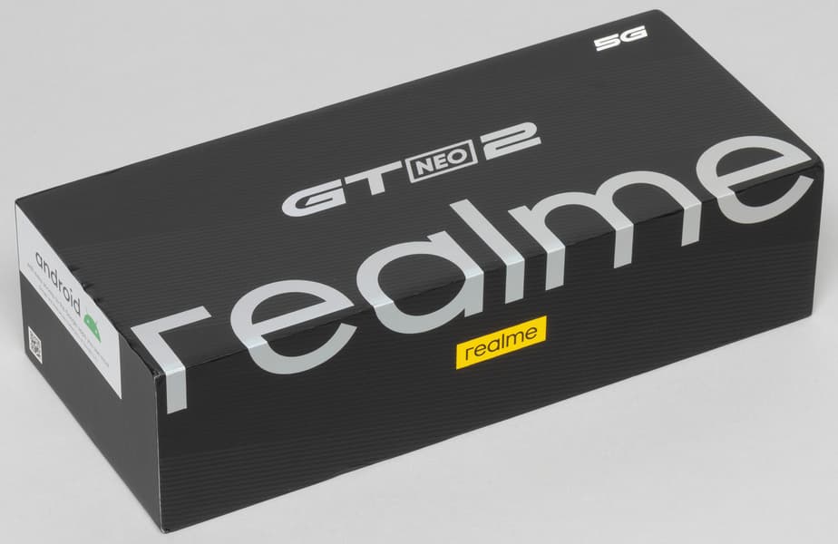 Realme GT Neo 2 поставляется в большой картонной коробке с увеличенными примерно на четверть от стандартных размерами и строгим черно-белым оформлением.