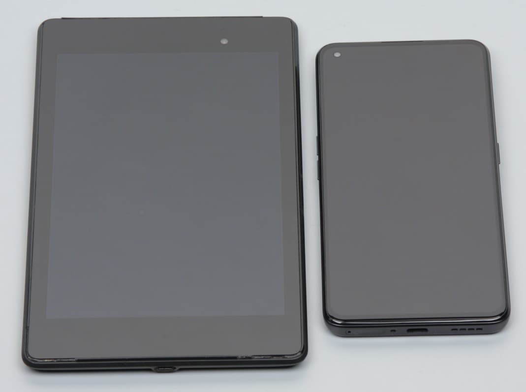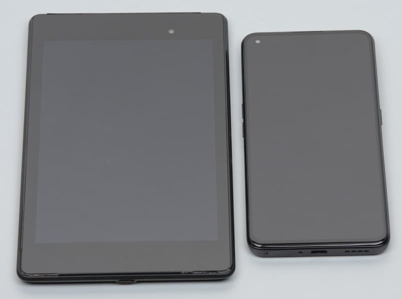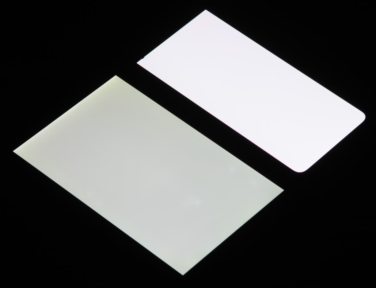 Лицевая поверхность экрана выполнена в виде стеклянной пластины с зеркально-гладкой поверхностью, устойчивой к появлению царапин. Судя по отражению объектов, антибликовые свойства экрана не хуже, чем у экрана Google Nexus 7 (2013) (далее просто Nexus 7). Для наглядности приведем фотографию, на которой в выключенных экранах отражается белая поверхность (слева — Nexus 7, справа — Realme GT Neo 3T, далее их можно различать по размеру):