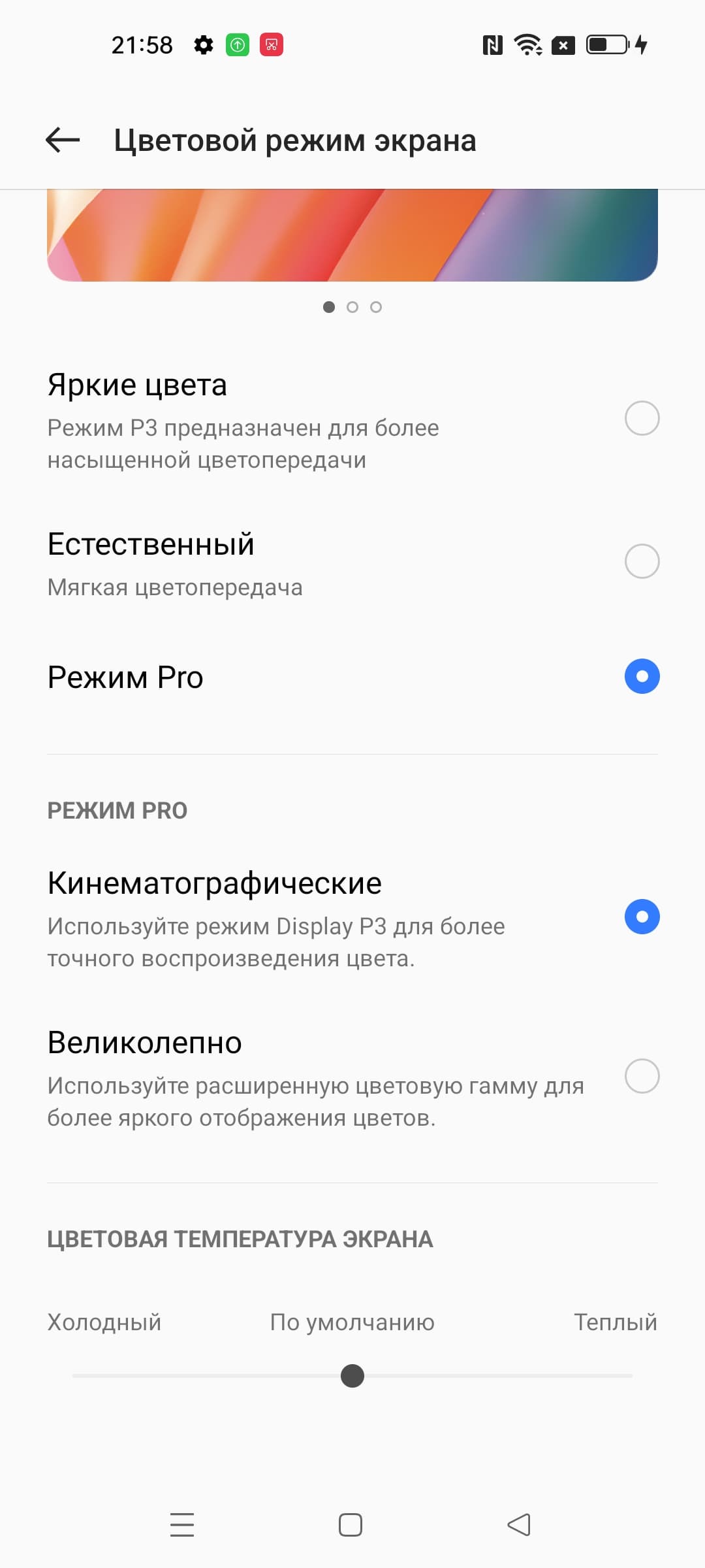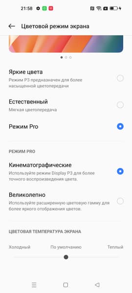 Фотография выше получена для профиля Яркие цвета в настройках экрана, который выбран по умолчанию. Профилей всего четыре: