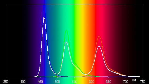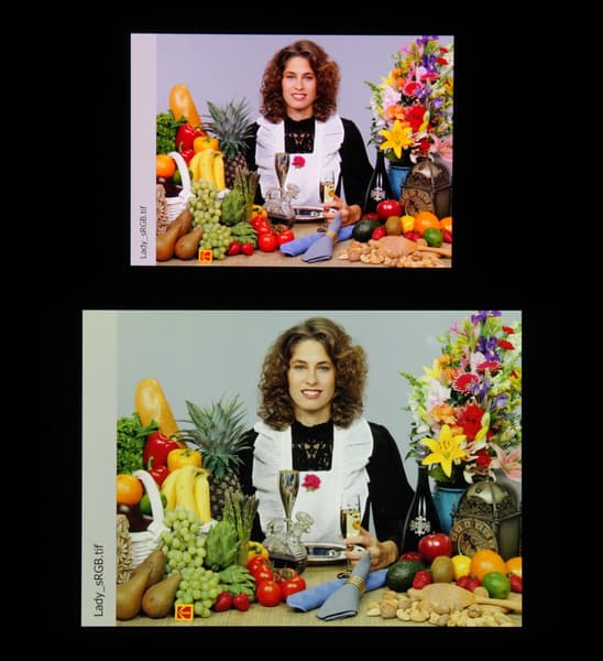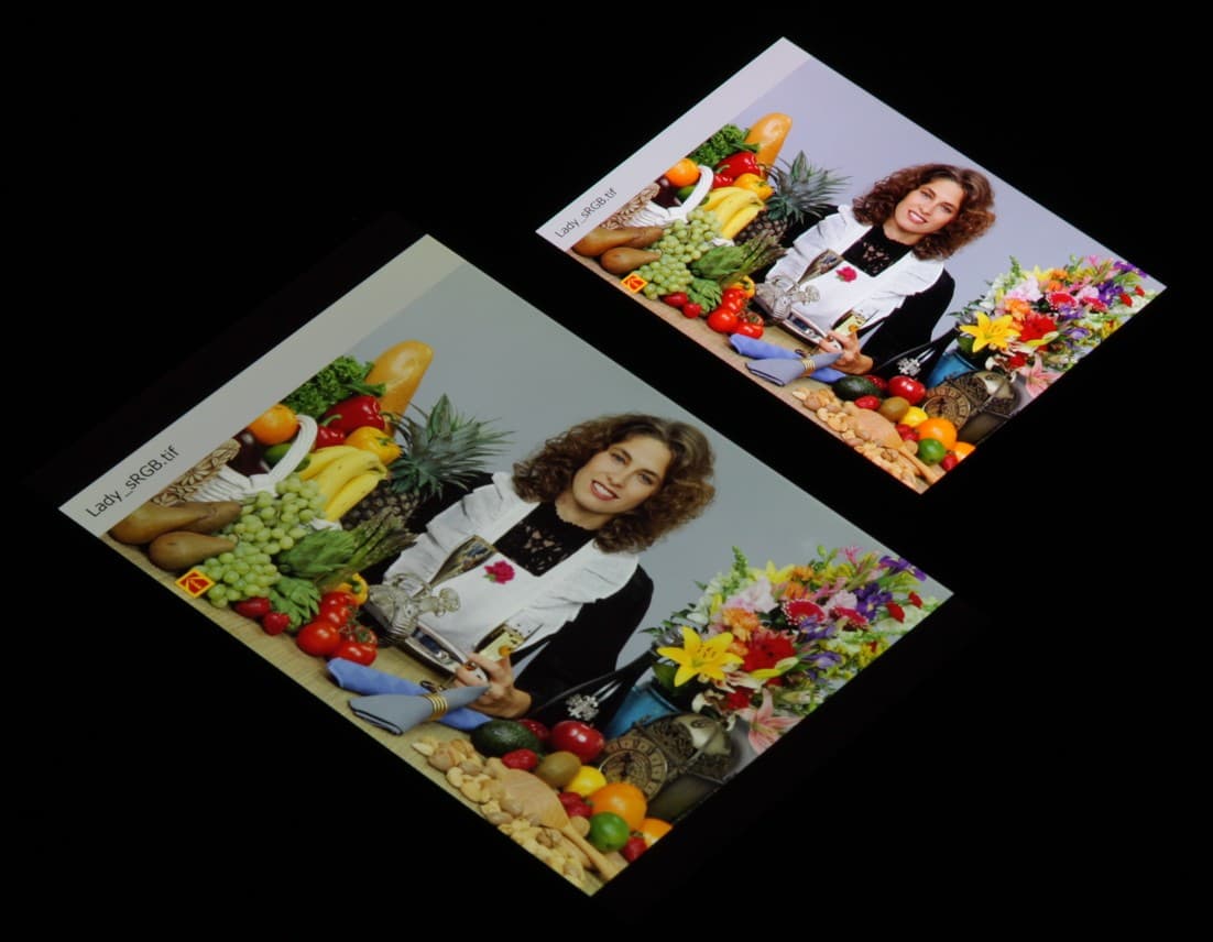 Цвета на экране Realme GT Neo 3T перенасыщены (обратите внимание на помидоры, бананы, салфетку и оттенок лица), а цветовой баланс заметно отличается. Напомним, что фотография не может служить надежным источником сведений о качестве цветопередачи и приводится только для условной наглядной иллюстрации. В частности, выраженный красноватый оттенок белого и серого полей, присутствующий на фотографиях экрана Realme GT Neo 3T, при перпендикулярном взгляде визуально отсутствует, что подтверждается аппаратными тестами с помощью спектрофотометра. Причина в том, что спектральная чувствительность матрицы фотоаппарата неточно совпадает с этой характеристикой человеческого зрения.