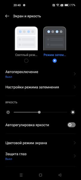 При ручном управлении яркостью и при выводе белого поля во весь экран максимальное значение яркости составило около 460 кд/м², а на очень ярком свету и в случае автоматической регулировки оно повышается до 600 кд/м². Также нужно учитывать, что в данном случае чем меньше площадь белого на экране, тем он светлее, то есть фактическая максимальная яркость белых участков будет почти всегда выше указанных значений. В итоге, учитывая отличные антибликовые свойства, читаемость днем на солнце, должна быть на хорошем уровне. Минимальное значение яркости — 1,8 кд/м², поэтому в полной темноте яркость можно понизить до комфортного значения. В наличии автоматическая регулировка яркости по датчику освещенности (он находится на фронтальной панели близко к ее верхнему краю правее решетки фронтального громкоговорителя). В автоматическом режиме при изменении внешних условий освещенности яркость экрана как повышается, так и понижается. Работа этой функции зависит от положения ползунка регулировки яркости: им пользователь может попытаться выставить желаемый уровень яркости в текущих условиях. Если не вмешиваться, то в полной темноте функция автояркости уменьшает яркость до 9 кд/м² (сойдет), в условиях освещенного искусственным светом офиса (примерно 550 лк) устанавливает на 130 кд/м² (нормально), а условно под прямыми лучами солнца повышает до 600 кд/м² (до максимума). Результат по умолчанию нас удовлетворил, но для эксперимента мы попробовали понизить яркость в полной темноте. Яркость стала ниже, но после цикла повышения внешней освещенности и ее снижения, все вернулось к тем же значениям, что были до вмешательства. Получается, что функция автоподстройки яркости хоть и работает адекватно, но не позволяет пользователю настраивать свою работу под индивидуальные требования.