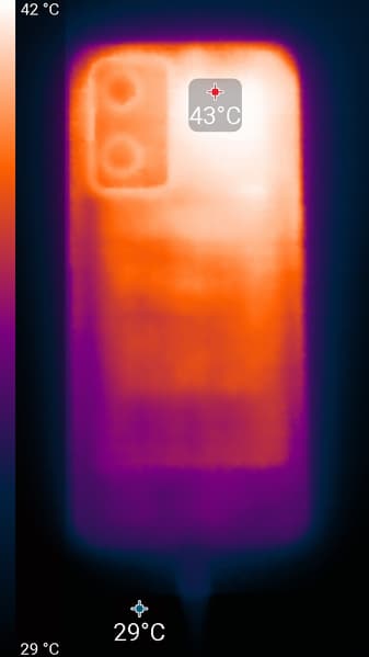 Нагрев больше в верхней части аппарата, что, видимо, соответствует расположению микросхемы SoC. По данным теплокамеры, максимальный нагрев составил 43 градуса (при температуре окружающего воздуха в 24 градуса), это несколько выше среднего значения в данном тесте для современных смартфонов.