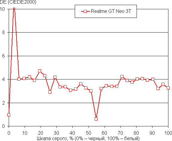 (Самые темные области шкалы серого в большинстве случаев можно не учитывать, так как там баланс цветов не имеет большого значения, да и погрешность измерений цветовых характеристик на низкой яркости высокая.)