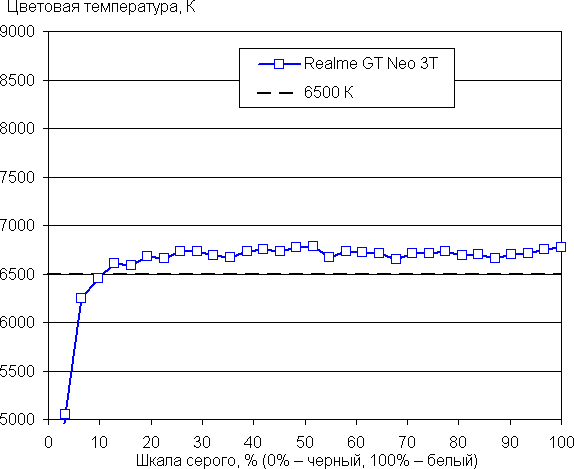 Баланс оттенков на шкале серого после выбора профиля Естественный хороший — цветовая температура близка к стандартным 6500 К, при этом на значимом участке шкалы серого этот параметр мало изменяется, что улучшает визуальное восприятие баланса цветов. Отклонение от спектра абсолютно черного тела (ΔE) ниже 10 единиц, что для потребительского устройства считается неплохим показателем, и разброс этой характеристики также не очень большой: