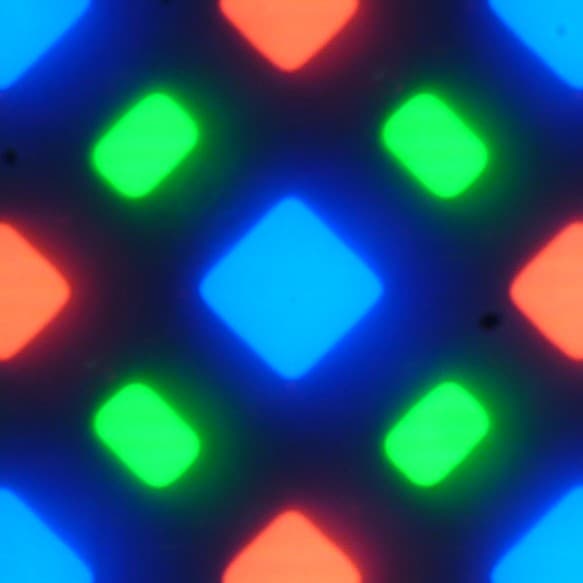 В этом экране используется матрица Super AMOLED — активная матрица на органических светодиодах. Полноцветное изображение создается с помощью субпикселей трех цветов — красного (R), зеленого (G) и синего (B), но красных и синих субпикселей в два раза меньше, что можно обозначить как RGBG. Это подтверждается фрагментом микрофотографии: