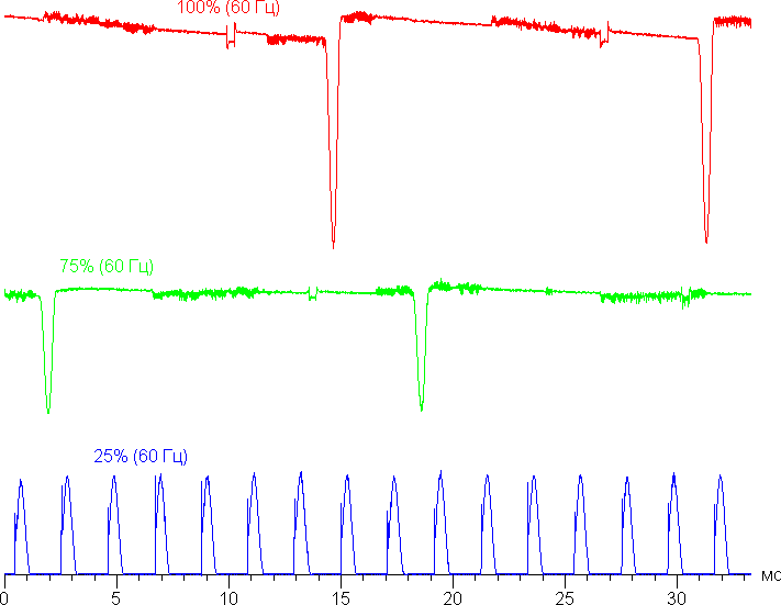 На любом уровне яркости присутствует значимая модуляция с частотой 60, 120 или 480 Гц. На рисунке ниже приведены зависимости яркости (вертикальная ось) от времени (горизонтальная ось) для нескольких значений настройки яркости. Сначала для режима с частотой обновления 60 Гц: