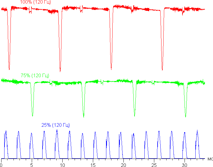 Частота модуляции на высокой яркости увеличилась до 120 Гц, а на средней и низкой характер модуляции такой же, как в случае частоты обновления 60 Гц — мерцание можно обнаружить.