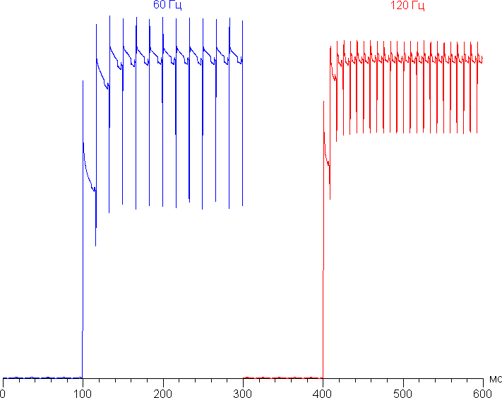 Переключение состояния элементов матрицы выполняется практически мгновенно, но на фронте включения может присутствовать ступенька шириной примерно 17 мс (что соответствует частоте обновления экрана примерно в 60 Гц) или примерно 8 мс (120 Гц). Например, так выглядит зависимость яркости от времени при переходе от черного к белому (режим 60 Гц и 120 Гц):