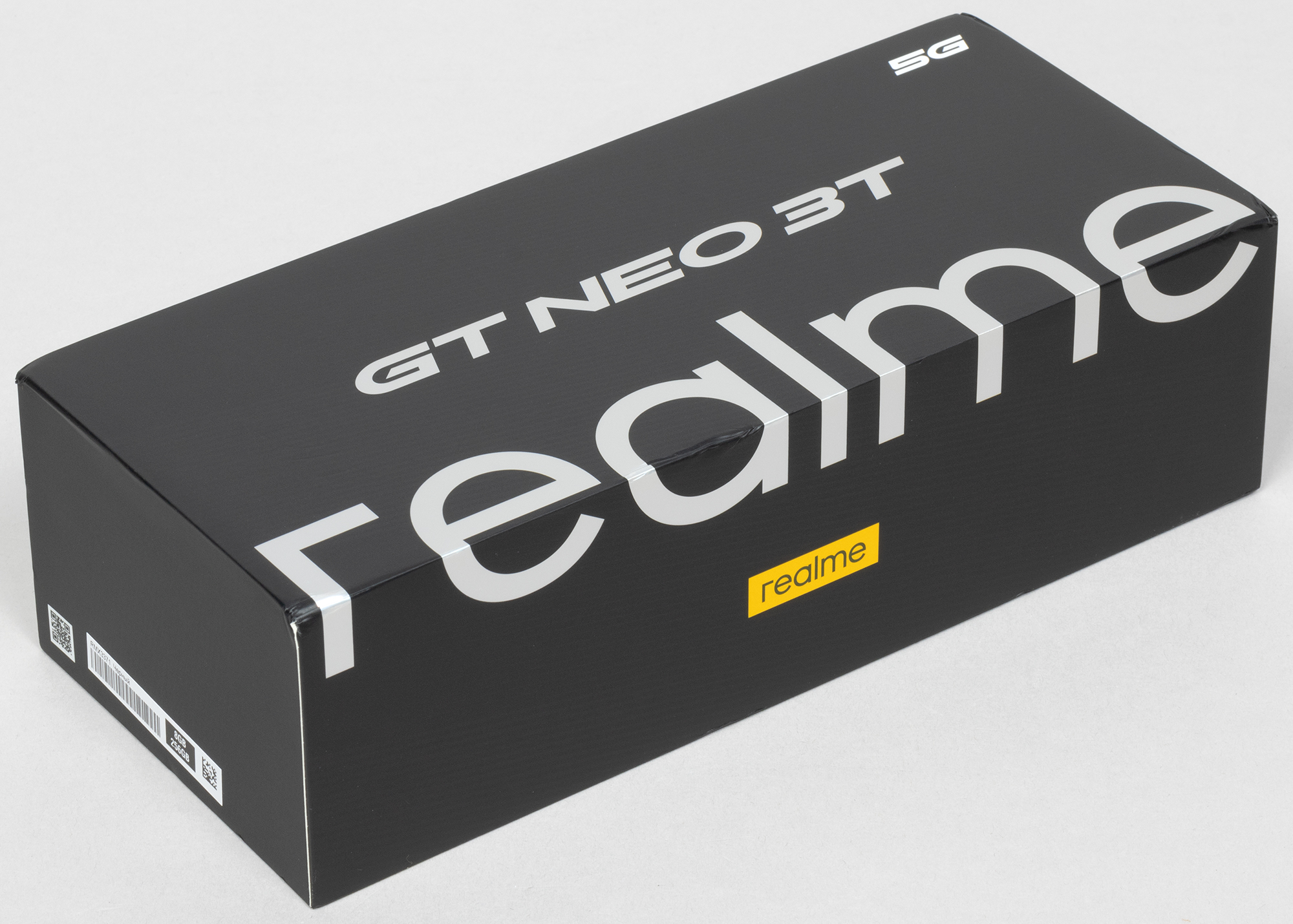 Realme GT Neo 3T поставляется в большой картонной коробке с увеличенными примерно на четверть от стандартных размерами и строгим черно-белым оформлением.