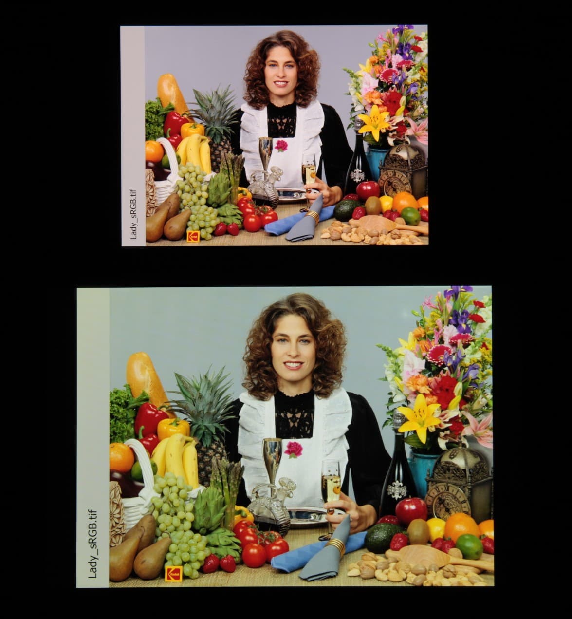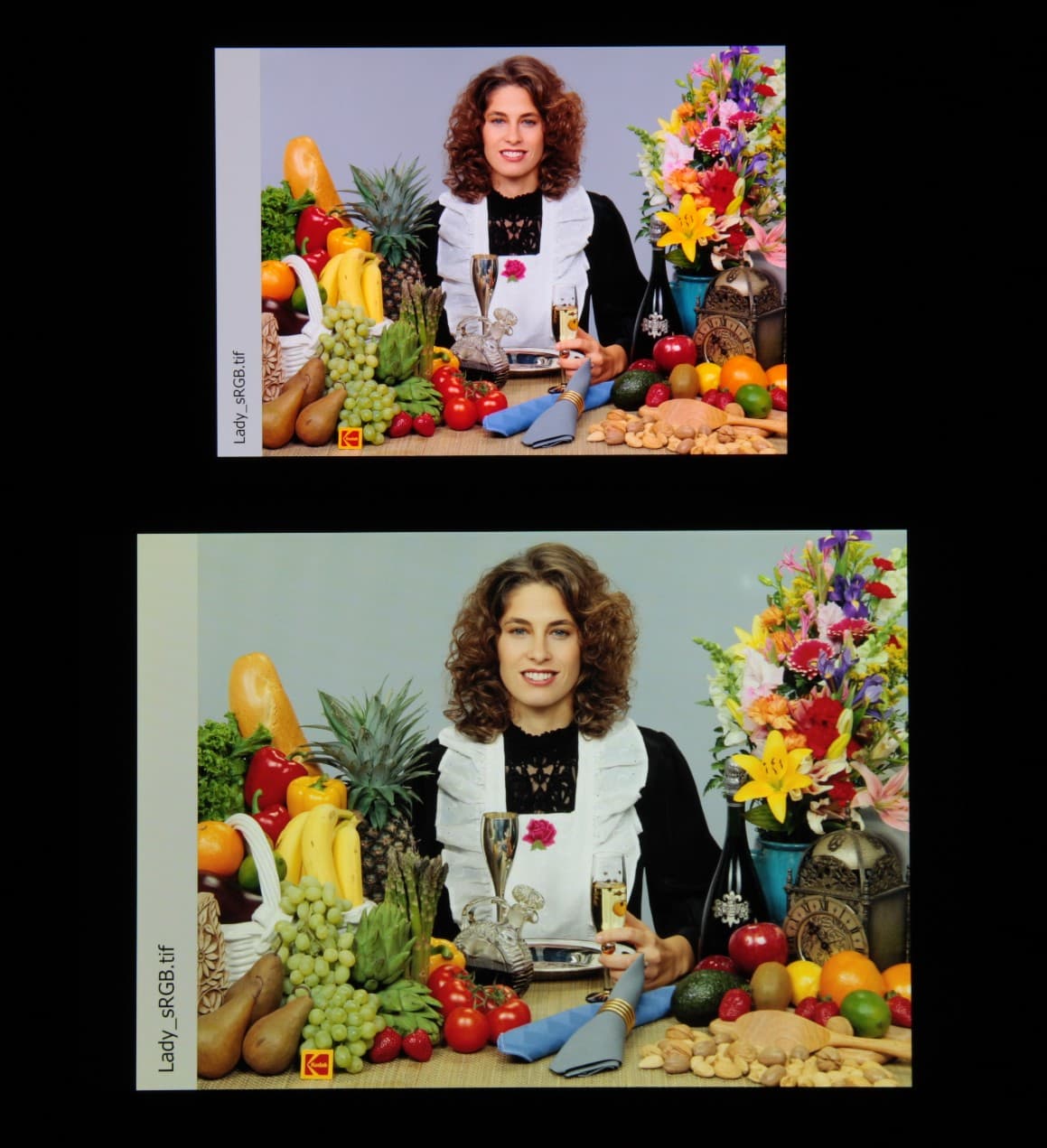 Цветовой охват в режимах Яркие цвета и Кинематографические шире sRGB и практически равен DCI-P3: