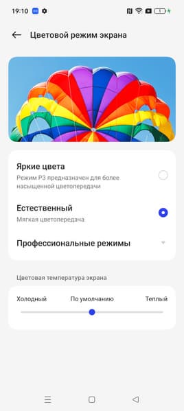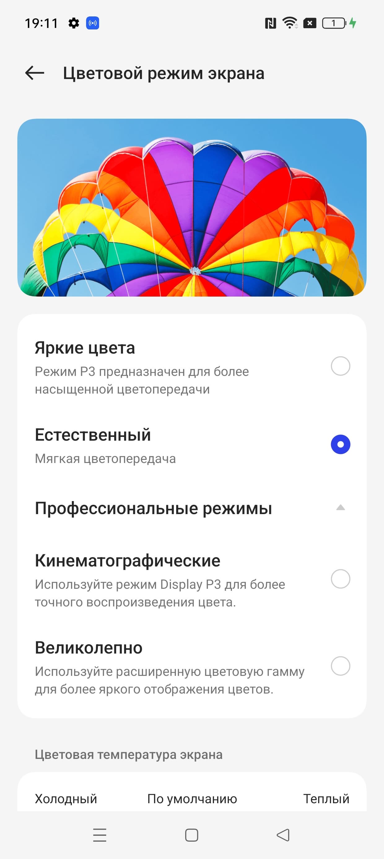 Фотография выше получена для профиля Яркие цвета в настройках экрана, который выбран по умолчанию. Профилей всего четыре: