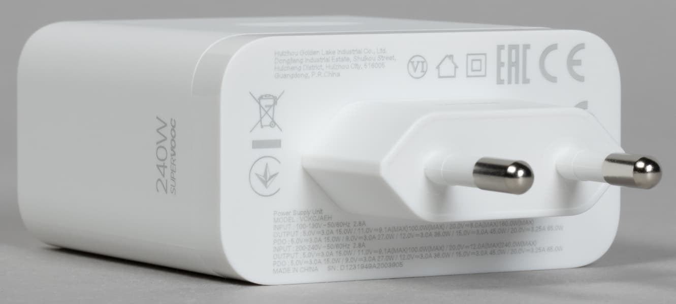 Релиз гласит: «Уникальной особенностью блока питания является его конструкция и современный материал (нитрид галлия). Максимальная в отрасли плотность мощности 2,34 Вт/см³ обеспечивает высокую эффективность преобразования энергии в 98,5% с максимальной стабильностью зарядки. Заряд смартфона контролируется тремя микроконтроллерами, которые регулируют силу входящего и выходящего токов и напряжения, обеспечивая максимальную скорость и безопасность зарядки. SuperVOOC 240 Вт — первое в мире зарядное устройство мощностью 240 Вт, сертифицированное TÜV Rheinland, что подтверждает его безопасность».